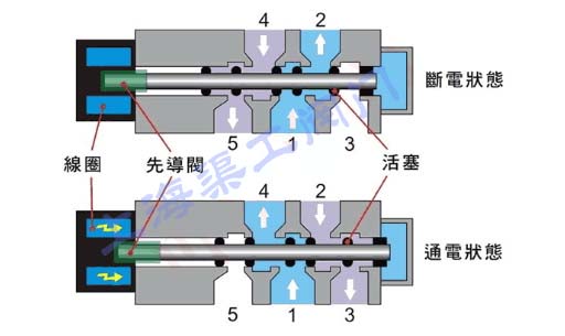 單電控二位五通電磁閥工作原理: